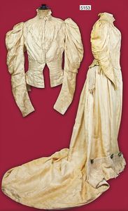 Damenkleid, 2-tlg., um 1900, in sich geblümt, runder Ausschnitt, hinten Druckknopfreihe, 3/4-Arm, Ärmelende mit Spitze, Rock 3x Volant, schöner Zust.