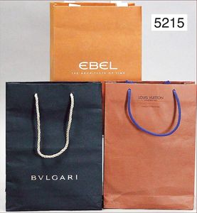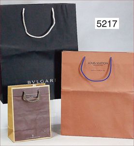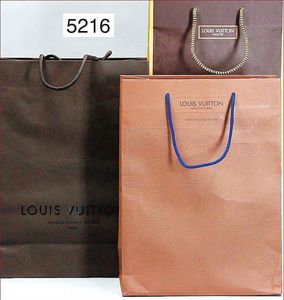 Konv. Papiertragetüten, 1x Bulgari, 41x34 cm, Kordelhenkel, dazu LV Malletier, 17x23 cm, 1 Papiertragetüte LV, cognacfarben, 37x32 cm, schönes Konv., Zust. 1 - 2