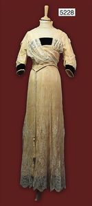 Rene Bornel Damenkleid, ca. 1910, teilw. alte Spitze, Keulenärmel, vorne Knopfreihe, grünes Unterkleid