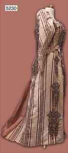 Damenkleid, ca. 1880, 2-tlg., Bluse mit schwarzem Spitzeneinsatz, roséfarbene Seide, verziert mit Perlen und Pailletten, innen verstärkter Tailleneinsatz, alte Hakenverschlüsse, leichter Stehkragen, Vorderseite V-förmig geschnitten, leichter Keulenarme, teilw. etwas verschlissen, dazu schwarzer Spitzen-Überrock, mit langer Schleppe, ausgefallen
