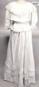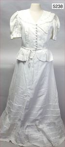 Vera Mont Paris Damenkleid, 2-tlg., weiß, ca. um 1900, Knopfreihe vorne, V-Ausschnitt, kurzer Ärmel, dazu weißer Unterrock, sehr schöner Zust.