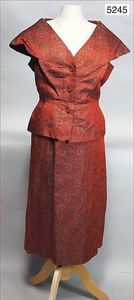Horn Modehaus Berlin 2-Teiler, späte 50er Jahre, Bluse mit Rock, kurzärmelig, Knopfreihe vorne, Rock mit seitl. Metall-Reißverschluss, innen Kunstseide, breiter Kragen, 45 cm Durchmesser der Bluse, feines asiatisches Muster, rot/blau schimmernd, schöner Orig.-Zust.