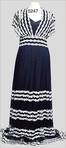 Damenkleid, 30er Jahre (Walzerkleid), bodenlang, tiefer V-Ausschnitt, blauer Tüll, mit weißen Stickereien, seitl. Druckknöpfe und Hakenverschluss, unterfüttert mit marineblauer Taftseide, sehr schöner Orig.-Zust., Rücken teilw. transparent, ausgefallen, ca. Gr. 36, 28 cm Durchmesser der Taille, 1,60 m lang