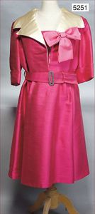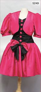 CHOU CHOU Damen-Cocktailkleid, frühe 80er Jahre, pink/schwarz, Kunstseide, Puffärmel, angenähtes Bolero-Jäckchen, Hinterseite mit Plastik-Reißverschluss, vorne durchgehende Knopfreihe, mit großer Schleife, knielang, Gr. 38, Taillendurchmesser 36 cm, schöner Orig.-Zust.