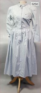 JIL SANDER Damenkleid, mit Bubikragen, Knopfreihe vorne, 1 Brustfülltasche, lange Ärmel, knöchellang, weiß/blau gestreift, ca. Gr. 36-38, Taillendurchmesser 33 cm, schöner Orig.-Zust.