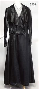 Konv. Damenkleider, Seidensatin, um 1925, 1x leichter V-Ausschnitt, schwarz unterfüttert, 2 Druckknöpfe, Seidengürtel, 39 cm Durchmesser der Taille, bodenlang, dazu Damenkleid, Seidensatin, mit breitem Kragen, Seidengürtel, fein abgenähte Ärmel, 40 cm Durchmesser der Taille, bodenlang
