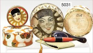 Konv. Pappmaché-Dosen mit lithog. Papier beklebt, gem. Rachel Ocre Rose Nr. 2, Poudre de Couleur, Durchmesser 7 cm, 1 Dose Tokalon Paris gestempelt naturelle, mit ausgefallenem Clown-Motiv, teilw. etwas verschlissen, 1 Messing-Dose, gem. Tokalon Paris, mittig mit Emaille-Motiv Clown, ca. 1930, innen mit Spiegel und Puder, 4 cm, 1 Nagelset, silber gepunzt, kl. Bürste mit integriertem Kamm und Spiegel, 8 cm, 1 Stift, ausgefallen, 9 cm, sehr schönes Konv., bitte besichtigen, schöne Deko für Damen-Frisiertisch