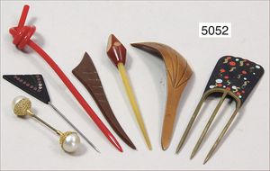 Konv. 7 Haarnadeln in Brauntönen, 1 Nadel mit Perlenschmuck, 5 cm, 1 filigran gearbeitete Nadel, 14 cm, ausgefallen, bitte besichtigen