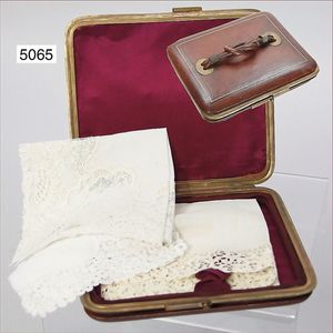 Taschentuch-Etui, ca. 1910, Leder geprägt, walnußbraun, gedrehter Trageriemen (Leder), Messingbeschläge, verschließbar, innen fuchsiafarbene Seide, mit alten Spitzentaschentüchern, Füllmenge größenverstellbar, 17 cm breit, 14 cm hoch, bei Bedarf bis zu 6 cm hoch, ausgefallen