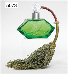 Parfümflacon, grün, ca. 1925, geschliffenes dickes Glas, Silberzerstäuber, Sprühquaste verhärtet, etwas abgenutzt, 15 cm breit, 12 cm hoch, ausgefallen, schönes dekoratives Objekt
