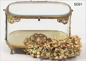 herrschaftl. Glasschatulle, mit Messingblech vergoldeten Ornamenten, auf Löwentatzenfüßen, 23 cm, breit, 16,5 cm tief, 15 cm hoch, mit Stoffblumenkopfkranz, schönes Dekorationsstück