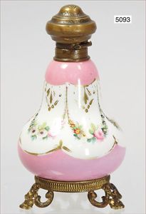 Parfümflakon, ca. 1910, Porzellan, birnenförmig, auf Messingblech vergoldeten Füßen, Klappverschluss, 6 cm Durchm. 12 cm hoch, ausgefallen, schönes Dekorationsstück