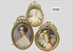 3 Bilderrahmen, Messingblech vergoldet, 1x rund, ca. 1890-1900, 3 Damenportraits auf Bein gemalt, feine Linien, versch. Größen (9-11 cm), ausgefallen