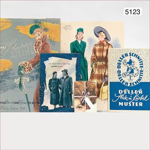 Mappe Das Schneideratelier, 1. Jahrgang, Nr. 2, mit ausgefallenen Modezeichnungen, Damen in eleganten Kleidung, Wintersaison 1949, dazu kleiner Kalender von Wella, 1963, 1 Zeitschrift Kleppermantel, dazu Deller Strick- und Kürbelmuster, schönes Konv.
