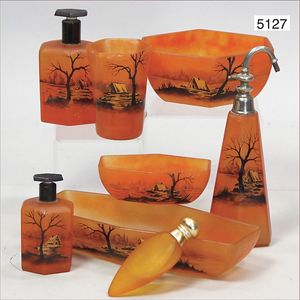 ausgefallenes Glas-Set, orange, Motiv "Haus am Fluss", 1 Seifenspender, 1 Parfümflakon, 2 gr. Schalen, 12 cm und 24 cm lang, 1 Schale 15 cm, 2 Flakons mit Deckel, bitte besichtigen