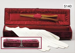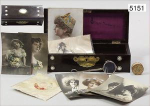 Holzschatulle, mit Schloss, dazu Schlüssel, mit ovalem Perlmuttdekor, Innenfutter fliederfarbene Seide, 1 Brille, Messingblech vergoldet zum Aufklappen, 27 cm breit, 9 cm hoch, 11 cm tief, dazu Postkarten, beschrieben, 1910+12, 1 Taschentuch mit Stickerei, 1916, schönes Konv.
