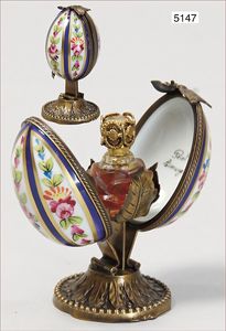ausgefallener Parfümflakon, gemarkt Peint Main AF Nimoges Francais, Porzellan-Ei, aufwendig bemalt, auf der Spitze mit Schmetterlingsverschluss, 8 cm hoch, Ei zum Öffnen, mittig Parfümflakon, geschliffenes Glas, milchig, Deckel Messingblech vergoldet