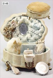 ausgefallene Biedermeier-Schmuckdose, Samt bezogen, Muschelform, auf Löwentatzenfüßen, Innen gepolstert, mittig ovaler Spiegel mit altem Spiegelglas, 36 cm breit, 19 cm tief, 13 cm hoch, 1 Puderquaste aus Gänseflaum, 1 ausgefallener Parfümflakon, geschliffenes Glas, tropfenförmig, Silberverschluss zum Klappen, filigran gearbeitet, 10 cm, dazu 1 silberne Puderdose mit Perlmutt-Rose mittig, Perleneinsatz, 7 cm Durchm., 1 Stofftasche, mit silberner Perlenarbeit, ausgefallen