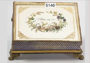 ausgefallene Klosterdose, ca. 1870, mit lithogr. Papier beklebt, Goldornamente, Deckel mit Glashaube, darunter feine Stickereiarbeit mit kleinsten Perlen, Aufschrift "Psalm 119, 105", auf Löwentatzenfüßen, 20 cm tief, 22 cm breit, 8 cm hoch
