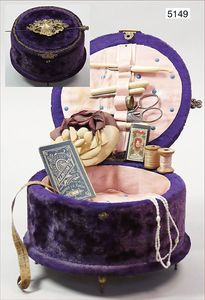 Nähschatulle, mit Signatur Paris qualite excelsior Rita Lorma Nr. 14118; mit lilanem Samt bezogen, Messingblech vergoldete Ornamente, Innen rosafarbene Seide, gefiedert, dazu reichhaltiges Zubehör mit Beingriffen, u.a. Silberschere als Kranich, alter Nähfaden und Garn, mit Musikspielwerk, defekt, dazu Schlüssel, 20 cm Durchm. 13 cm hoch, auf 4 Füßen