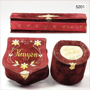 wohl Biedermeier, Damenschatullen, ausgef. geformt, 1 Samt-Schatulle, Messingblech vergoldeter Verschluss, florale Stickerei, 20 cm breit, 10 cm hoch, 1 Schatulle für Manschetten, passend dazu mit Stickerei, runde Form, 14 cm hoch, Durchm. 15 cm, 1 Schatulle für Hosenträger, 33 cm breit, 8 cm hoch, ausgef.