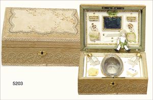 ausgef. Schatulle, Stoff bezogen, floral bestickt, innen mit lithogr. Papier, Puppen-Waschszene, mit Kamm, Bürste, Seife, Perlenketten, Parfumflacons, mittig ovales Glas, fein geschliffen, mit Porzellan-Puppe, Alter ?, franz., 20 cm breit, 14 cm tief, 9 cm hoch, ausgef., dekorativ