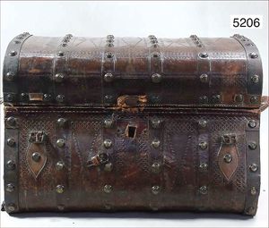 herrschaftl. Truhe für Kutsche, um 1800, 72 cm breit, 49cm hoch, mit geprägtem Leder bezogen und schmiedeeisernen Metalteilen verziert, 3 Schnallen vorne sowie seitl. Griff fehlt, mit Innenfach und Einlagebox, altersbed. schöner Orig.-Zust.