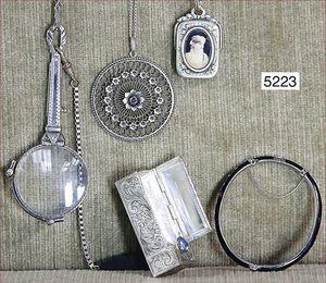 Jugendstil Silber-Accessoires, 1 filigran gearbeiteter Lippenstift-Flacon mit blauem Stein, 1 ausgefallene Klappbrille, feine Silberarbeit, dazu 1 Armreif, Kette und Medaillon, schönes Konv.