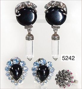 Konv. Damenmodeschmuck, 2 Clips-Ohrringe mit tropfenförmigen schwarzen Stein, umringt mit blauen Glassteinen, dazu Clips-Ohrringe mit Geparden Motiv, 2 geschliffene tropfenförmige Steine, Glas, dazu passend Pyramidenring, sehr schönes Konv., ausgefallen, bitte besichtigen
