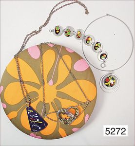 Konv. 60er Jahre Modeschmuck, 1 Armband, silberne Oblaten mit grün/gelb/rot/schwarzen Farbkleksen, dazu passend runde Kette, keine Stempelung erkennbar; dazu 1 Kette mit dreieckigem Anhänger, blaues Glas, 1 Kette wohl handarbeit, gemarkt NIA, mittig mit fliederfarbenem Quarz, in Orig. 60er Jahre Box, Durchm. 24 cm, schönes Konv.