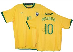Nationalmannschafts Trikot, mit Orig.-Unterschrift des Fußballers, Ronaldo Luís Nazário de Lima, kurz Ronaldo, Nr. 10, in Brasilien auch als Ronaldo Fenômeno bekannt. Der Stürmer war in seiner Karriere u. a. in den Topligen Spaniens sowie Italiens aktiv und zählte dort jeweils zu den erfolgreichsten Torschützen. Er wurde mit der brasilianischen Nationalmannschaft 1994 und 2002 Fußball-Weltmeister und mehrfach zum Weltfußballer sowie Europas Fußballer des Jahres gewählt