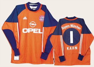 Orig. Triko des Fußballers Oliver Khan, Bayern München, Nr. 1, mit orig. Unterschtrift, ehemaliger deutscher Fußballtorhüter und heutiger Fußballexperte des ZDF, der den größten Teil seiner Profikarriere beim FC Bayern München spielte
