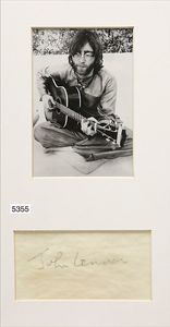 s/w-Fotografie u. Unterschrift von John Winston Lennon, 9.Oktober 1940 in Liverpool geborgen, britischer Musiker, Komponist und Autor, weltberühmt als Sänger und Gitarrist der britischen Musikgruppe "The Beatles", Abzug einer Fotografie wohl Mitte 60er Jahre, ausgefallen