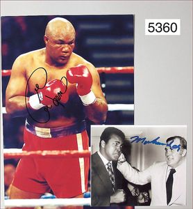 Konv. 2 Fotografien (Abzüge) von Boxstar Muhammad Ali und George Foreman, beide mit Orig.-Unterschriften, Muhammad Ali s/w Fotografie, schönes Konv.