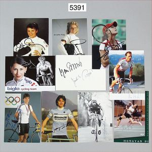 Konv. Autogrammkarten, 2x Fechter Zita Funkhausner und Annette Klug, darunter Tennisspieler Alice Kornet und Hongyan Pi, u.a. Langstreckenfahrradfahrer Uwe Ampler, Jutta Niehnhaus, Zulfia Zabirova, schönes Konv.