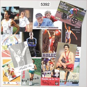Konv. 14 Autogrammkarten, Stabhochsprung, Floé Kühnert, Marc Raquil, Christian Olosson, Philip Ospaly, Radsport, Gewichteheber Szymon Kolecki, Orig.-Unterschrift von Axel Schulz, Ringer Franz Langthaler, Ringer Martin Knops 1977, Astrid Kumbernuss, Kugelstoßerin, schönes Konv.