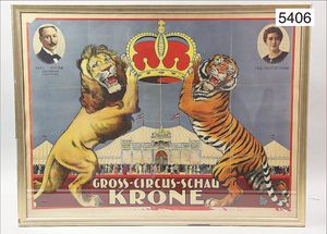 Zirkus Krone, Orig.-Plakat, ca. 1910, kl. Fehlstellen am Rand, 1 Einrissstelle, gerahmt, 2 Abbildungen von Karl Krone, Direktor und Eigentümer, sowie Frau Direktor Krone, Zirkusschau Krone, sign. Cith Adolph Friedländer Hamburg Nr. 6750, 70 cm hoch, 93 cm breit, ausgefallen