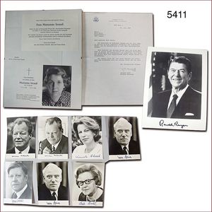 Konv. Autogramme, Persönlichkeiten aus Politik und Wirtschaft sowie Dr. Mildred Scheel, Helmut Schmidt, 2x Walter Arendts, Willi Brandt, Käthe Strubel, Ronald Reagan, mit Brief von Richard Ruff, 27. Juli 1984, schönes Konv., bitte besichtigen