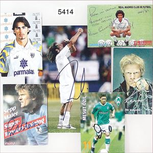 Konv. signierte Fußballkarten, Spieler wie Mesut Özil, mit Orig.-Unterschrift, Oliver Kahn, Real Madrid Spieler Hugo Sanchez, Torwart Sepp Maier und Dino Baggio, dazu ein Großbild von Frankie Hejduk, mit Orig.-Unterschrift, schönes Konv.