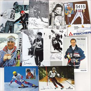 Konv. Postkarten sowie Fankarten von bekannten Skispringern und Skiläufer, z.B. Kurt Huggler Schweiz, Franz Heinzer, Rudolph Nierlich, Peter Wirsenberger, Daniela Zini, Thomas Wasserberg Schweden und vieles mehr