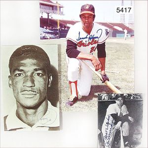 Konv. 3 Autogrammkarten, amerik. Sportler, schwarz-weiß-Foto mit Unterschrift "Best Wishes Joe Dimaggio, intern. amerik. Baseballstar und Geliebter von Marilyn Monroe, dazu 1 Fanfoto mit Unterschrift von Frank Robinson, Baseball Outfealder (Baltimore Orioles), ausgefallen