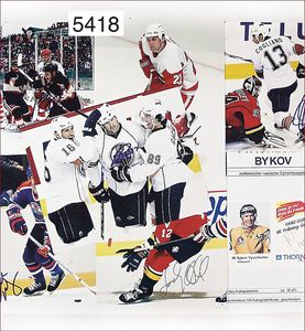 Autogrammkarten von bekannten Eishockeyspielern, u.a. Fabian Bronnström, schwedischer Eishockeyspieler, spielt für Dermes Star Eishockeyliga, 1986, dazu Andrew Cogliano, kanadischer Eishockeyspieler, spielt bei Edmonton Oilers, dazu Brett Lebda, spielt bei Dedroit Red Wings, Jody Hull, Ben Eager, Chicago Black Hawks, Charlie Huddy, spielt für Edmon Oilers, Orig.-Unterschriften, ausgefallen