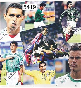 Konv. Autogrammkarten bekannter mex. Fußballer, Claudio Suarez, Verteidigung, dazu Raphael Marquez, Aaron Galingon, Abwehrer, Antonio Naeleson Mathias, Oswaldo Sanchez, Claudia Sanches und Ramon Morales, ausgefallen