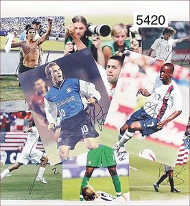 Konv. US-amerik. Fußballspieler, u.a. Landon Donovan, Stürmer, Damarcus Beasley, linkes Mittelfeld, Franky Hejduk, Abwehr Mittelfeld, Briana Scurry, Torfrau, 1990, Stammhüterin der US-Frauenfußball-Nationalmannschaft, u.a. Clint Dempsey, Stürmer, Franky Hejduk, Claudio Reyna, Mittelfeld und Tim Howard, Torwart, alles Orig.-Unterschriften