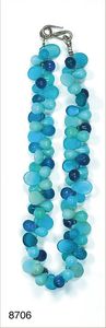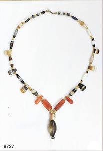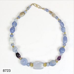 Calcedon Steinperlenkette ( Saphirin), um 1200 vor Chr.(bronzezeitlich), die 29 unterschiedlichen Steinperlen werden ergänzt von zwei Amethysten und einer fac. Zentralperle aus der gleichen Zeit. Die Kette ist mit neuzeitlichen Goldperlen (min. GG 750/000) tragbar zusammengestellt, Länge ca. 50 cm