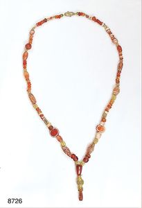 Weiß geätzte Karneolperlenkette, 3tes Jahrtausend vor Chr.(1te baktrische Bronzezeit), teilweise ältere Goldperlen (min GG 750/000), Mittelperle granuliert, Länge der tragbaren Kette ca. 54 cm