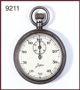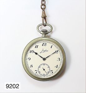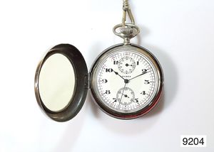 Taschenuhr, HUBER (Doctor´s Watch), Metall, gebläute Zeiger, Stoppfunktion, kleine Sekunde auf 6 Uhr, leichter Abplatzer auf dem Emaillezifferblatt, Uhr läuft, Metallkette und Schutzgehäuse
