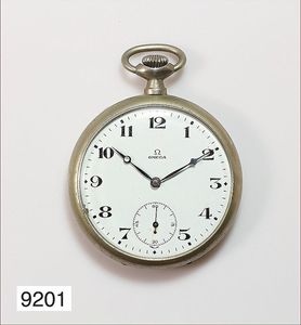 Taschenuhr, OMEGA, Metall, kleine Sekunde auf 6 Uhr, gebläute Zeiger, Ankerhemmung, Brequetspirale, Zifferblatt minimal beschädigt, Uhr läuft ist aber überholungsbedürftig ( Sekundenzeiger fest )