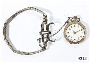 Damen Taschenuhr, Gold 585/000, mit Armspangenhalterung, Emaillezifferblatt leichter Riss, Uhr läuft