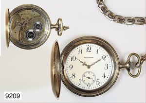 Taschenuhr, WALTHAM, Double, mit Uhrenkette, 20/30er Jahre, feiner Haarriss im Emaillezifferblatt, Steine in Schraubchatons, 15 Juwelen, mehrere Reparaturzeichen, Uhr läuft, Aufzug beschädigt